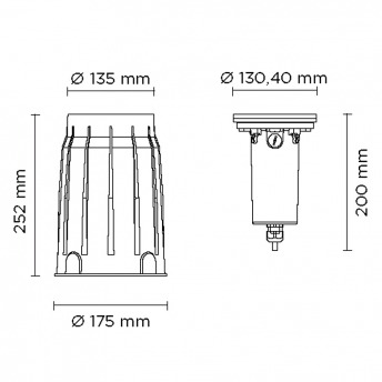 Dış mekan kurulumu için çapı 130 mm, yere gömme armatür, fosfokromatize ve polyester toz boyalı, döküm bakır içermeyen alüminyum gövde, temperli emniyet camı, kalıplanmış silikon conta. Işık kaynağı eğim sistemi dışarıdan +/- 15 derece. Dahili LED sürücüsü 220-240V 50-60Hz, 1 CREE CXB1304 LED ile. IP67 derecesi.
