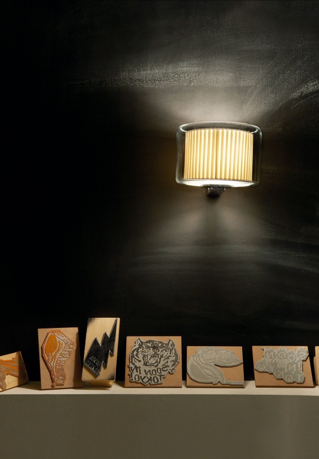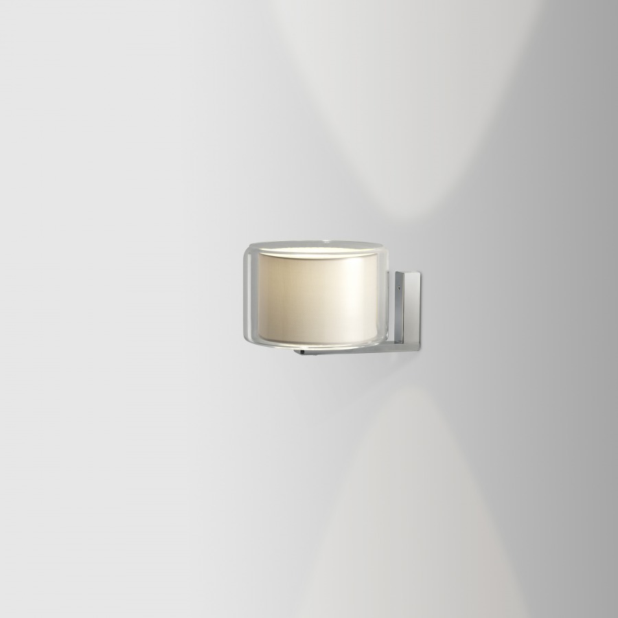 The beauty of the Mercer collection comes not only from its essential shape, but from how its materials blend together. The transparent blown glass structure surrounds the textile shade, which seems to float, conveying a sense of airiness and sophistication.