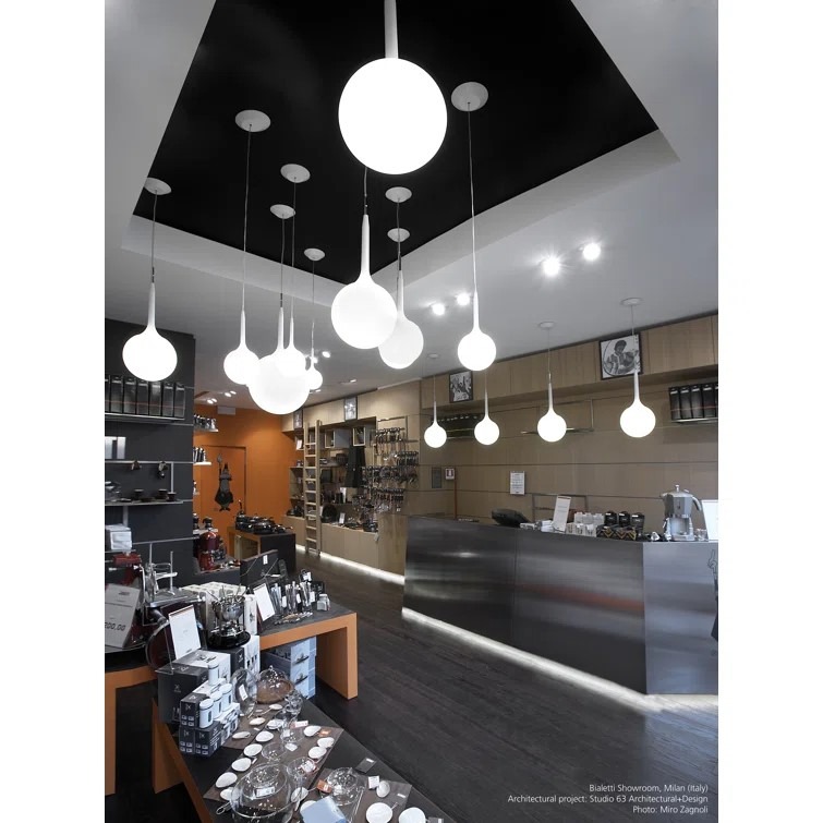 Küresel difüzör tasarımı, güçlü difüzör ışığından kör lamba yapısı alanına tatlı bir geçiş sağlayan, çıkarılabilir ve sivrilen bir ışıklı gövde ile geliştirilmiştir. Termoplastik reçineden tavan gülü ve gövdesi, üflemeli cam difüzör.