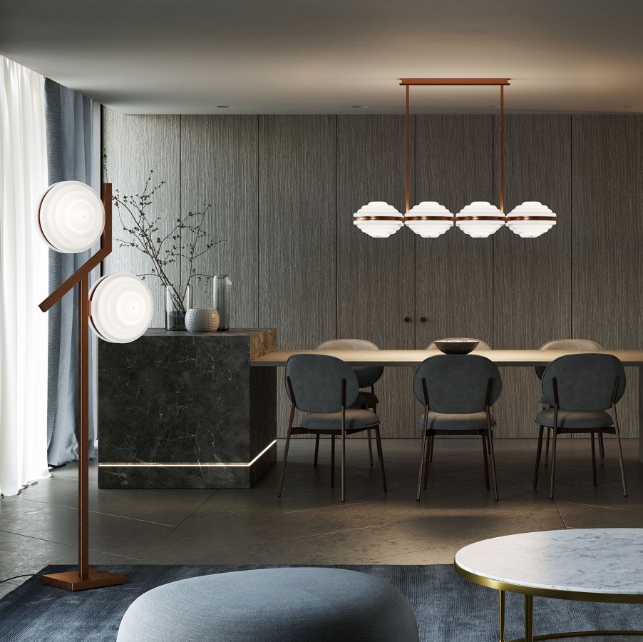 820 / P ELLEPI Floor lamp in metal with bronze finish and satin blown glass diffusers. Available in chromatic variants. Modern Incanto Catalog.